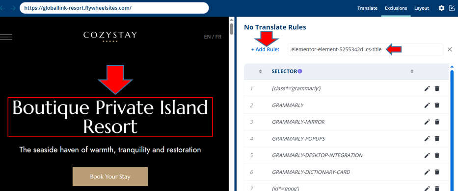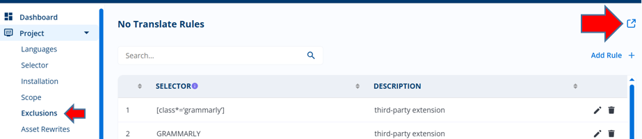 To add a No Translate Rule, right-click on the block or component on your webpage that you wish to protect from translation. The selector for this block or component will be automatically added to the right-hand pane. Now click the "+Add Rule" link to the left of the selector: