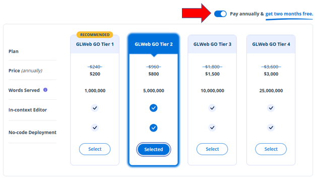 On the following page, you can select the new plan you wish to change to, as well as a monthly or annual subscription. Use the radio button indicated by the red arrow below to toggle between monthly or annual options. Annual subscriptions are discounted by 2 months.